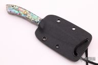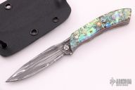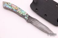 This Bird and Trout Neck Knife by Jake Elenbaas features an Alabama Damascus blade with .097" blade stock and .728" blade depth, full tang construction. The handle has clear scales with mosaic abalone backing and red liners, mosaic pins. Comes with a kydex neck sheath. New from maker.