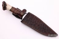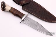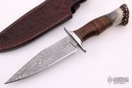 This fighter by Shawn Smith features a Feather Damascus blade with .189" blade stock and 1.496" blade depth, hidden tang construction. The handle has a stainles steel guard, crown stag and stacked leather grip with black/yellow spacers. Comes with a hand tooled brown leather sheath. New from maker.