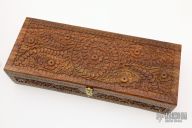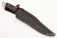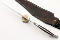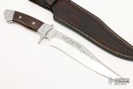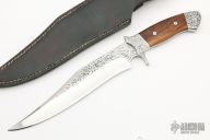 This fighter by Shawn Smith features a mirror polished blade with false top edge and engraved flats, .198" blade stock and 1.798" blade depth, full tapered tang construction. The handle has a engraved stainless steel bolsters, wood scales with black spacers/liners, engraved tang spine. Comes with a hand tooled brown leather sheath and a hand carved wooden display box with brass latch. New from maker.