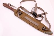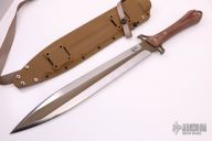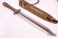 This Murder Tactcal Gladius by OmniVore BladeWorks features a hand rub satin finished double edged blade with powder coated fuller, ricasso and tang. The handle has brown canvas micarta scales over full tang construction, .209" blade stock and 2.205" blade depth. Includes a side deploying kydex sheath with shoulder harness. Has a couple light scratches on the blade, otherwise excellent condition. The Opossum Tracks on the blade are engraved and painted blue to signify the blade material is CPM3V.