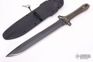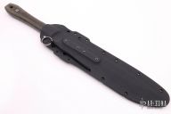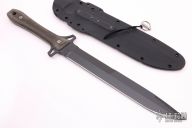 This Horribilis Bowie by OmniVore BladeWorks features a black coated blade with sharpened top edge near guard. The handle has black canvas micarta scales over full tang construction, .214" blade stock and 1.491" blade depth. Includes a side deploying kydex sheath with locking pin. Excellent condition. The Opossum Tracks on the blade are engraved and painted blue to signify the blade material is CPM3V.