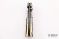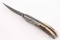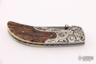 The Vaquero by Johnny Stout features a Bruce Bump "Eastwood" Damascus blade with a single thumbstud with a mammoth ivory inlay. The handle has 416 stainless steel bolsters with beautiful gold inlaid engraving by Alice Carter, really nice bark mammoth ivory scales, fileworked and anodized titanium liners, fileworked Damascus backspacer. Nice lockup, action and blade seating. Comes with a zippered case and COA dated November 12, 2020. Excellent condition. NOTE: The button must be pressed when firing AND when closing.