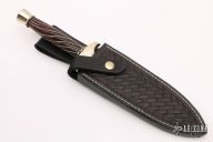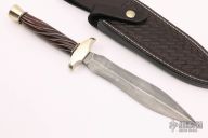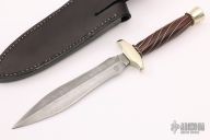 This dagger by Jot Singh features a Damascus blade with .157" blade stock and 1.148" blade depth, hidden tang construction. The handle has nickel silver guard and butt, spiral fluted desert ironwood grip with twisted silver wire inlays. Comes with a hand tooled black leather sheath and a zippered case. Excellent condition.
