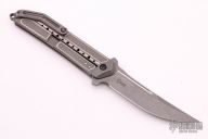Todd Begg Knives is happy to announce the formation of the new Steelcraft Series with the release of the first full production knife, The Sun Tzu Kwaiken. With the Sun Tzu Kwaiken they have joined forces with Reate Knives to bring you the highest quality in design and function that they feel is attainable in a production knife. All of the Steelcraft Series knives will be designed with an emphases on precision workmanship to showcase that a production knife can truly be a thing of excellence. They have made all the necessary steps to insure that Steelcraft will deliver a knife that will stand up to scrutiny and surpass all prior experience of what a production knife can be. 6Al4V titanium handle CPM-S35VN blade steel Framelock with steel lock tip insert 3D machined pocket clip Ceramic detent Ceramic IKBS Design won “Best Tactical Folder” at the 2014 Knifemakers Guild show. Has some light scuffs, otherwise excellent condition. Comes with a zippered case.