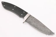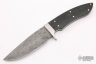This hunter by Stamascus Knife Works features a Damascus blade, .127" blade stock and 1.158" blade depth, full tapered tang construction. The handle has a stainless steel guard, black linen micarta scales. Has some light scratches, otherwise good condition.