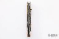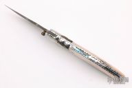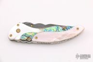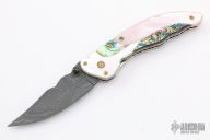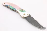 This knife features a Damascus blade with a single thumbstud with a green stone inlay. The handle has peal and abalone scales with gold plated screws, fileworked stainless steel liners and backspacer with abalone inlay. Nice detent, lockup and blade seating. Comes with a zippered case. Excellent condition.