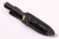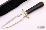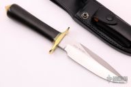 This was the first club knife made for the Randall Knife Society and was first offered in 1991. Marked "RKSA 757/505" on back of blade. Has a satin finished spear point blade with sharpened top edge, .208" blade stock and 1.205" blade depth, hidden tang construction. The handle has a brass double guard and butt, black linen micarta grip with black and brass spacers. Comes with a black leather sheath. Excellent condition.