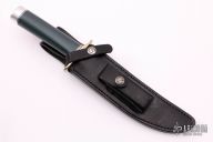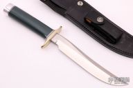 This model 3-7 Recon Style Fighter by Randall Made Knives features a satin finished stainless steel blade with a false top edge, .217" blade stock and 1.123" blade depth, hidden tang construction. The handle has brass a nickel silver guard and duralumin butt with a green G-10 grip. Comes with a black leather sheath. This knife is in excellent condition.