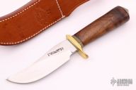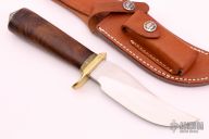 This Model 22 Outdoorsman by Randall Made Knives features a satin finished blade with notched thumbrest, .177" blade stock and 1.302" blade depth, hidden tang construction. The Model 22 is a thinly-beveled blade for the professional outdoorsman. The handle has a brass guard and butt, wood grip with black spacers. Comes with a brown leather sheath with belt loop. Excellent condition.