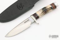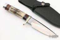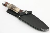 The Model 25-5 by Randall Made Knives is a drop point hunter similar to Model 11, but handle construction is reminiscent of 1930′s design. Excellent skinning, outdoors knife. This knife has a satin finished blade with notched thumbrest, .195" blade stock and 1.333" blade depth, hidden tang construction. The handle nickel guard and duralumin pommel, stag grip with stacked leather, black and duralumin spacers. Comes with black leather sheath. Excellent condition.