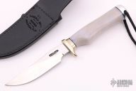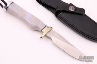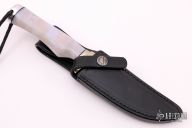 This Denmark Special from Randall Made Knives features a satin finished blade, .156" blade stock and .997" blade depth, hidden tang construction. The handle is comprised of a nickel silver single guard, pearlex grip, and a duralumin butt with black spacers. Comes with a black leather sheath. Excellent condition.