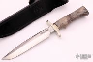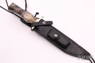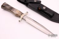 The Model 1 was made famous by Allied combat troops in World War II and has since been widely used in all theaters of war. .209" blade stock. 1.167blade depth, satin finish blade with sharpened top edge, hidden tang construction. The handle has a forward curved nickel silver guard and butt, wood grip, black spacers. Comes with black leather sheath. Excellent condition.