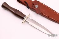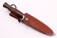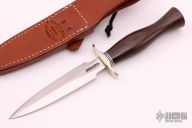 This Model 2-5 Letter Opener or Boot Dagger by Randall Made Knives features a double-edged satin finished blade with .169" stock and .988" blade depth, hidden tang construction. The handle has a nickel silver guard with a grown canvas micarta grip and black/duralumin spacers. Comes with a brown leather sheath. Excellent condition.