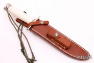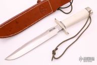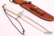 "The Model 1 was made famous by Allied combat troops in World War II and has since been widely used in all theaters of war." .199" blade stock and 1.162" blade depth, hidden tang construction. Has a satin finished blade with sawteeth on top edge. Nickel silver guard and butt, white linen micarta grip with black/duralumin spacers, and duralumin butt cap. Includes brown leather sheath. Has a few light scratches, otherwise excellent condition. Comes with a zippered case.