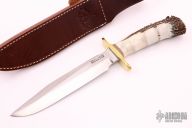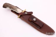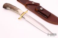 "This Randall Knives Model 1 was made famous by Allied combat troops in World War II and has since been widely used in all theaters of war." .216" blade stock. 1.185" blade depth, satin finish blade with sharpened top edge. The handle has a brass guard and stag grip with finger grips and red/white/blue spacers, compass in the butt. Includes a brown leather sheath. Has a couple light scratches, otherwise excellent condition.