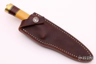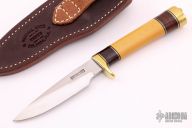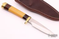 This Model 26 Pathfinder by Randall Made Knives is one of Randall's best selling models. It features a drop point satin finished blade with .159" blade stock and .894" blade depth, hidden tang construction. The handle has a brass guard and butt, yellow paper micarta grip and black/brass/leather spacers. Comes with a brown leather sheath. Excellent condition.