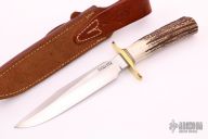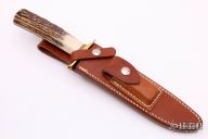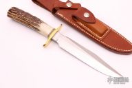 "This Randall Knives Model 1 was made famous by Allied combat troops in World War II and has since been widely used in all theaters of war." .211" blade stock. 1.198" blade depth, satin finish blade with sharpened top edge, hidden tang construction. The handle has a brass guard and stag grip with red/white/blue spacers. Includes a brown leather sheath. Knife is in excellent condition and shows no signs of use/carry. Comes with a Randall zippered case.
