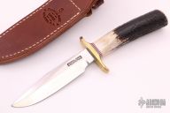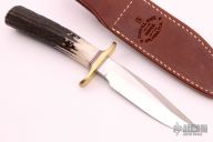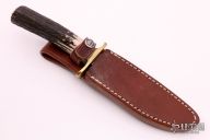 The Model 1-5 by Randall Made Knives has a brass guard, stag grip with red/white/blue spacers. Satin finished blade with sharpened top edge, .187" blade stock and 1.094" blade depth, hidden tang construction. Comes with a brown leather sheath. Excellent condition.