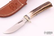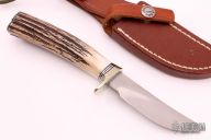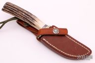 This Randall Made Model 21 has a satin finished upswept blade with notched thumbrest, .165" blade stock and a blade depth of .834", hidden tang construction. The handle has a nickel silver guard and butt plate with a stag grip, black/duralumin spacers. Knife comes with a brown leather sheath. Excellent condition.
