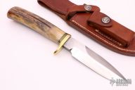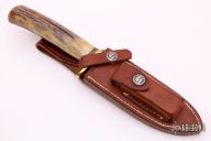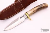 This Combat Companion by Randall Made Knives features a satin finished blade with notched thumbrest, .221" blade stock and 1.142" blade depth, 3" sharpened top edge. The handle is comprised of a brass guard, black fiber and brass spacers, stag grip. Excellent condition. Includes a brown leather sheath.