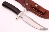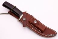 This model 4F by Randal Made Knives features a satin finished blade with a sharpened top edge, .203" blade stock and 1.314" blade stock, hidden tang construction. The handle has a nickel silver double guard, black and duralumin spacers, and a maroon linen micarta grip. Comes with a brown leather sheath. Excellent condition. Comes with a Randall zippered case.