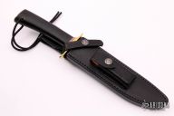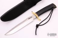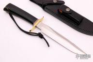 The Model 1 was made famous by Allied combat troops in World War II and has since been widely used in all theaters of war. .193" blade stock and 1.176" blade depth, Hidden tang construction. It has a satin finish blade with sharpened top edge. This blade has the sawteeth style grind with sawteeth. Brass guard and butt plate, black linen micarta grip with red/white/blue spacers. Includes black leather sheath. Excellent condition.