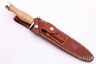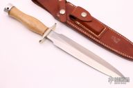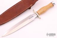 The Model 2-8 by Randall Made Knives is a heavily made dagger or dirk. Nickel silver guard, maple grip, duralumin butt cap, red/white/blue spacers. Double edged satin finished blade, .214" blade stock and 1.311" blade depth, hidden tang construction. Comes with a brown leather sheath. Excellent condition.
