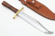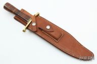 The Model 12-9 Sportsman Bowie by Randall Made Knives was made to meet the demand for a heavy-duty sporting knife of the Bowie type. This knife has a carbon steel blade with sharpened top edge, .221" blade stock and 1.577" blade depth, hidden tang construction. The handle has a lugged brass guard and butt, stacked leather grip with red/white/blue spacers. Comes with a brown leather sheath. Has some light spotting on the blade, otherwise excellent condition.