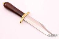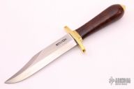 This Model 12-6 Sportsman Bowie from Randall Made Knives features a clip point bowie style blade with sharpened top edge, .215" blade stock and 1.199" blade depth, hidden tang construction. The handle is comprised of a forward curved brass guard and pommel with black spacers and desert ironwood burl grip. Comes with a zippered case. Excellent condition.