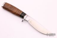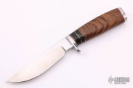 This Classic Hunter by Bob and Judy Lay features a satin/mirror finished blade with .201" blade stock and 1.103" blade depth, hidden tang construction. The handle has a stainless steel guard and butt, wood grip with black/copper/wood spacers. Excellent condition.
