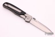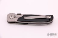 This TTF-3B linerlock folder by Bob Terzuola features a bead blasted blade with a thumbdisc and notched thumbrest. The handle has an orange peel finished titanium frame with black canvas micarta scales, tip up titanium clip. Smooth action. Nice detent, lockup and blade seating. Comes with a zippered case. Has been resharpened, has scuffs and scratches, otherwise good user condition.