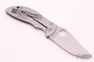 This knife by Spyderco features a satin finished blade with thumbhole and notched thumbrest. The handle has a bead blasted stainless steel frame, tip up paper clip style clip, stainless backspacer and lanyard hole. Comes with leather zippered case and papers. Nice detent and lockup. Excellent condition.