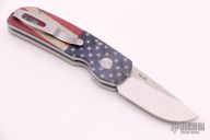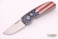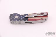 This Calmigo by Pro-Tech Knives features a California legal, satin finished drop point blade. The handle is comprised of an aluminum frame with a PK Custom anodized vintage American Flag, ramped sliding safety and mosaic push button. The steel deep carry pocket clip is positioned for right hand, tip up carry. Includes original box and paperwork. Excellent condition. #227