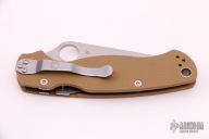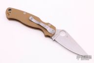 This Paramilitary 2 Linerlock Folder has a satin finished blade with thumb hole and notched thumbrest. Handle is coyote brown G-10 with stainless steel liners and stainless steel 4-way reversible clip. Excellent condition. Blade steel is CPM 10V.  Comes with original box and paperwork.