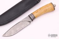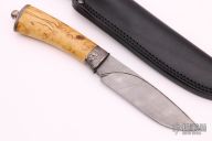 This knife features a Damascus recurve drop point blade with false top edge, .229" blade stock and 1.613" blade depth, hidden tang construction. The handle has a silver guard and butt with a birchwood grip. Comes with a black leather sheath and original box and papers.  Excellent Condition.