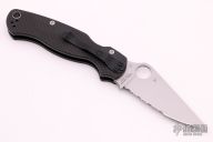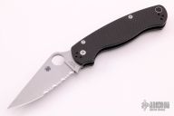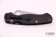 This Paramilitary 2 Linerlock Folder from Spyderco has a satin finished clip point partially serrated blade with thumbhole and notched thumbrest. Handle is textured carbon fiber with stainless steel liners and stainless steel 4-way reversible clip. Comes with original box and papers. Excellent condition.