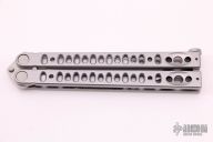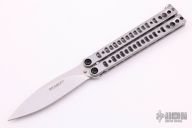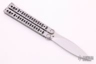 This Kimura 2 Balisong has a bead blasted Sandvik 14c28N drop point blade. Handle is bead blasted 410 stainless steel with T-Latch closure. Excellent condition with great mechanics. Good closure. Comes with original box.