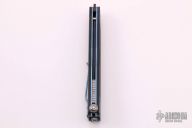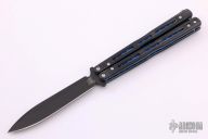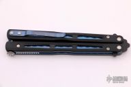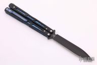 This Morpho 51 Balisong from Benchmade has a black spear point D2 stainless steel blade. Handle is black G-10 with blue anodized titanium liners and milled stainless steel spacers. Blue anodized titanium tip up clip and next-gen kicker pin. Comes with original box and paperwork. Excellent condition.