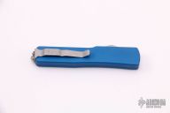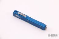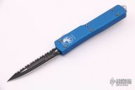 This UTX-70 OTF automatic by Microtech Knives features a D/E black finish blade with a fully serrated edge. Stainless steel clip. Blue aluminum frame. Serial number 25956 and dated 04/2015. Comes with original box and papers. Excellent condition.