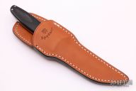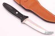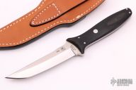 "It is only natural that Spyderco follow-up Bob Lum's folding tanto with a fixed blade, and a very classy one at that. It has a Hamaguri (appleseed) grind at the tip for added strength and the swedge on the spine lessens the overall weight. The blade has a tapered Tang, running the full length of the handle, adding overall strength. The expanded hand guard, where the blade and handle meet, makes it comfortable while gripping. Blade is hollow ground." The FB03 is a discontinued model no longer available from Spyderco. Includes original box, brown leather sheath and papers. Excellent condition.