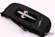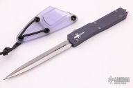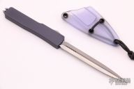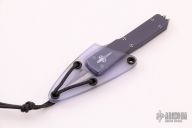 This knife features a 3.5" double edged blade with a stonewashed finish. The handle has a Gun Metal Gray anodized aluminum handle with dual glass breakers. When the knife is closed 1.25" of blade is sticking out of the top. Comes with kydex neck sheath. Dated 06/2014 and S/N 068. Comes with original box and COA. Excellent condition.