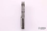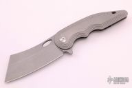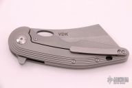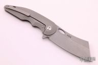 This War Admiral from VDK Knives features a tumbled reverse tanto cleaver style blade with swedge, thumb hole and flipper. The handle is comprised of a milled titanium frame over a titanium backspacer with matching tip up clip. Lanyard hole in pommel. Steel lockface insert on lock bar. Nice blade seating, detent and lock up. Excellent condition.