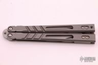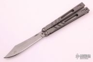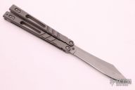 This Alpha Beast Balisong from Blade Runner Systems (BRS) features a tumble finished clip point blade. The handle has a millled and tumbled titanium.  No T-latch.  Scuffs are visible on handle and blade otherwise the knife is in good condition.