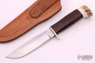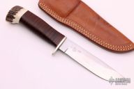 This Model 15 by Morseth Knives features a satin finished laminated steel blade with .174" blade stock and 1.039" blade depth, hidden tang construction. The handle has a nickel silver guard, stacked leather grip with black/red spacer pattern and a stag butt. Comes with a brown leather sheath. Has some scratches and patina, otherwise good condition. Dated 1992 and made by Bob Dozier