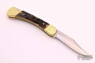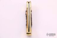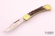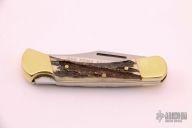 This Vintage German-made lockback by Puma has brass bolsters with integral liners. Very nice stag scales. Blade is satin finish. Comes with original box. Excellent condition. #13971