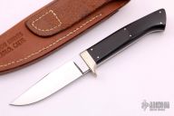 This Utility Hunter by Lloyd Pendleton features a mirror polished clip point blade with .178" blade stock and .813" blade depth, full tapered tang construction. The handle has a nickel silver guard and black wood scales with red liners. Includes a leather sheath. Has some scratches, otherwise good condition. #018 on ricasso.