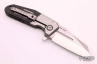 This Pocket Rocket by Shane Sibert features a hand rub satin finished blade with notched thumbrest and flipper. The handle has a milled titanium bolsters, titanium hardware, carbon fiber pivot collars, tip up anodized titanium clip with roller. Rides on bearings, nice detent, lockup and blade seating. Comes with a zippered case and COA. Excellent condition.