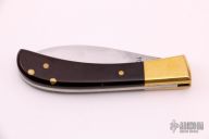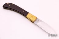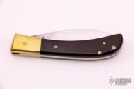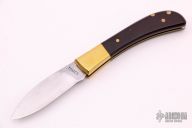 This Slipjoint by Master Smith PJ Tomes features a hand rub satin finished drop point blade. The handle has brass bolsters, pins and liners, black linen micarta covers, stainless steel spring. Has some light scratches, otherwise good condition for its age. #37 on the blade.