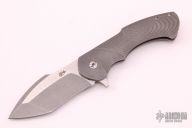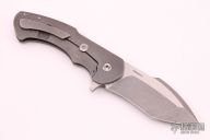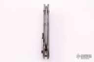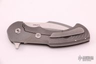 This Fallout mid-tech from Rick Barrett features a stonewashed/satin finished CPM35Vn blade. The handle scales are 3D sculpted and tumbled titanium. The pivot, screws standoffs, and pocket clip are also titanium. The pocket clip is positioned for tip up carry. Knife flips incredibly well on caged bearings. Great lockup, detent, and blade centering. Has some light scratches, otherwise good condition.