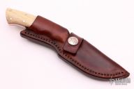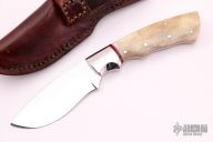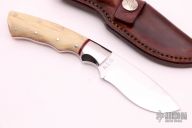 This skinner by Ron Best features a mirror polished blade with .123" blade stock and 1.103" blade depth, full tang construction. The handle has dovetailed stainless steel bolsters, giraffe bone scales with red liners and red/black spacers, stainless steel pins. Comes with a brown leather sheath. Has a couple light scratches, otherwise excellent condition.